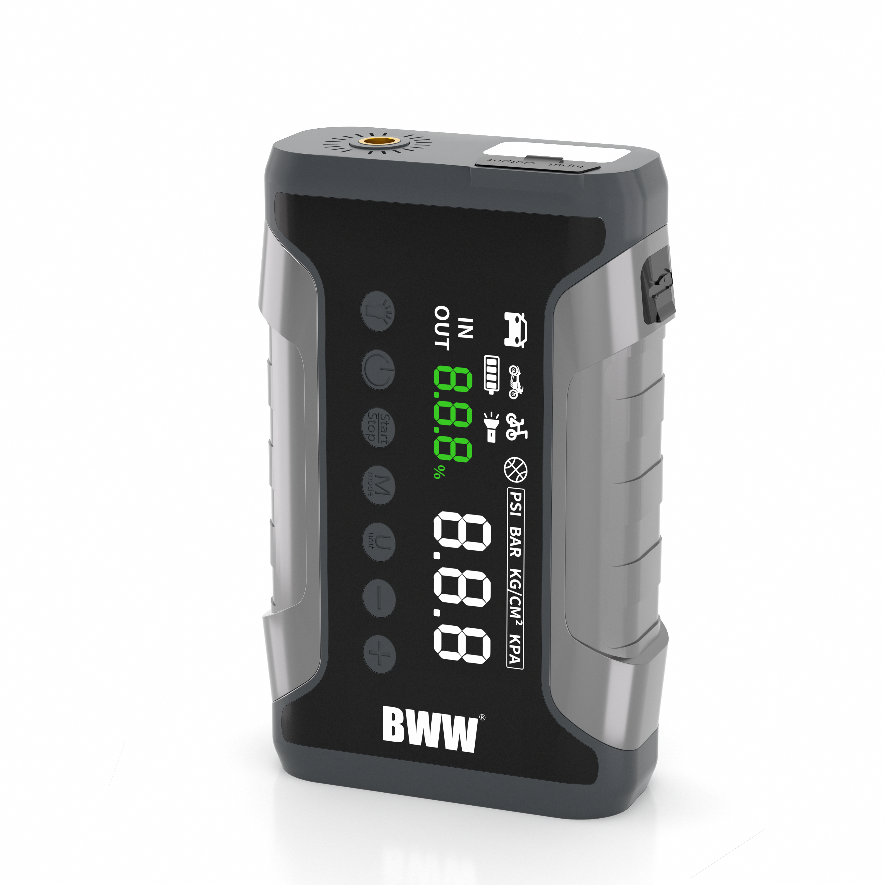 Produk ini juga merupakan perangkat multifungsi yang menggabungkan catu daya darurat dan pengisi angin ban otomatis.